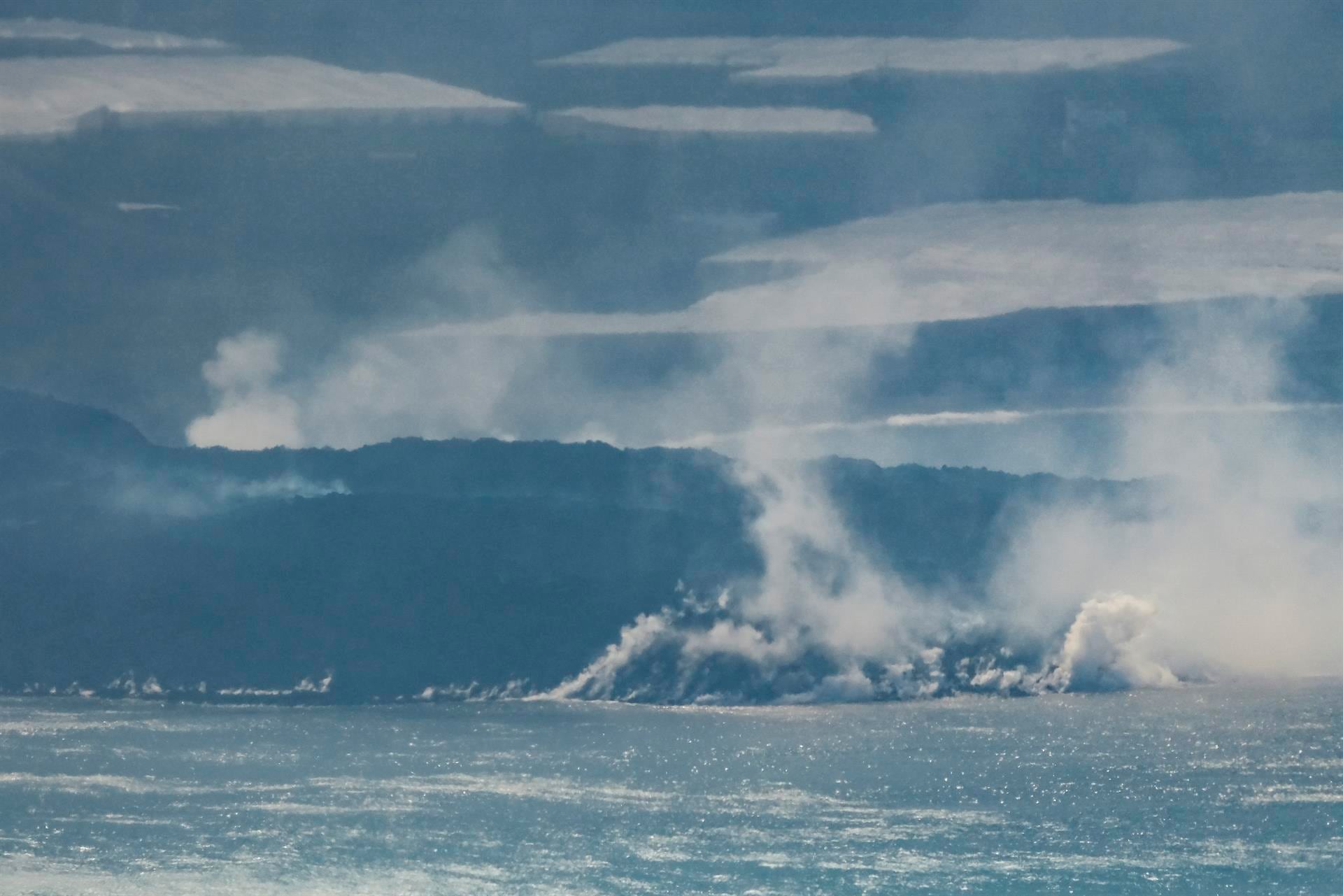 Al contacto con el mar, la lava ha comenzado a exhalar un humo que se desplaza hacia el interior de la isla o sale al mar, de acuerdo con la dirección del viento.