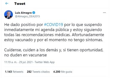 A través de su cuenta de Twitter, Luis Almagro dijo que a pesar de estar vacunado se había contagiado de Covid-19, sin presentar síntomas por el momento.