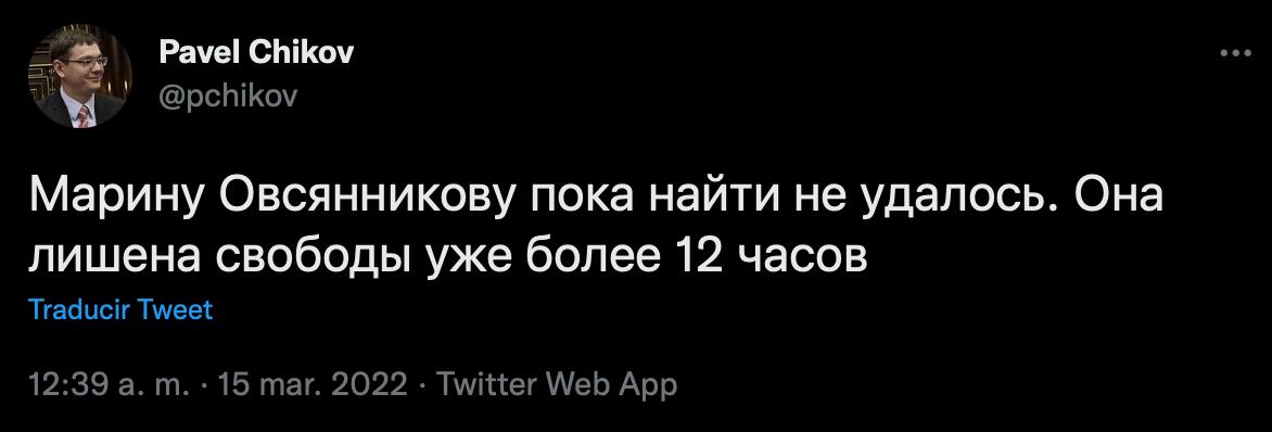 De acuerdo con su abogado, Pavel Chikov, especialista en derechos humanos, para las 9:39 de la mañana de este 15 de marzo, la periodista llevaba más de 12 horas presa; sin embargo, se desconoce su paradero.