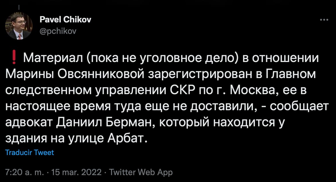 “El material (aún no es un caso penal) contra Marina Ovsyannikova se registró en el Departamento de Investigación Principal de la TFR en Moscú, aún no se ha entregado allí, - dice el abogado Daniil Berman, que se encuentra en el edificio en Arbat Calle”