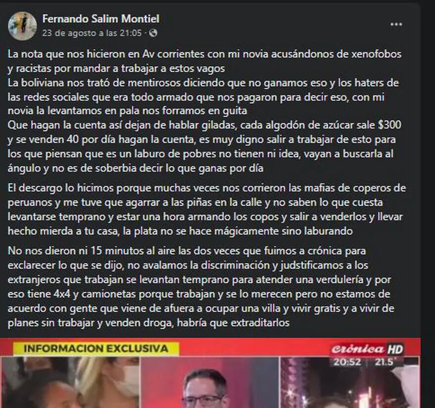 El 23 de agosto, acusó que lo calificaron de xenófobo y racista “por mandar a trabajar a estos vagos”, haciendo referencia a la comunidad boliviana que vive en Argentina.