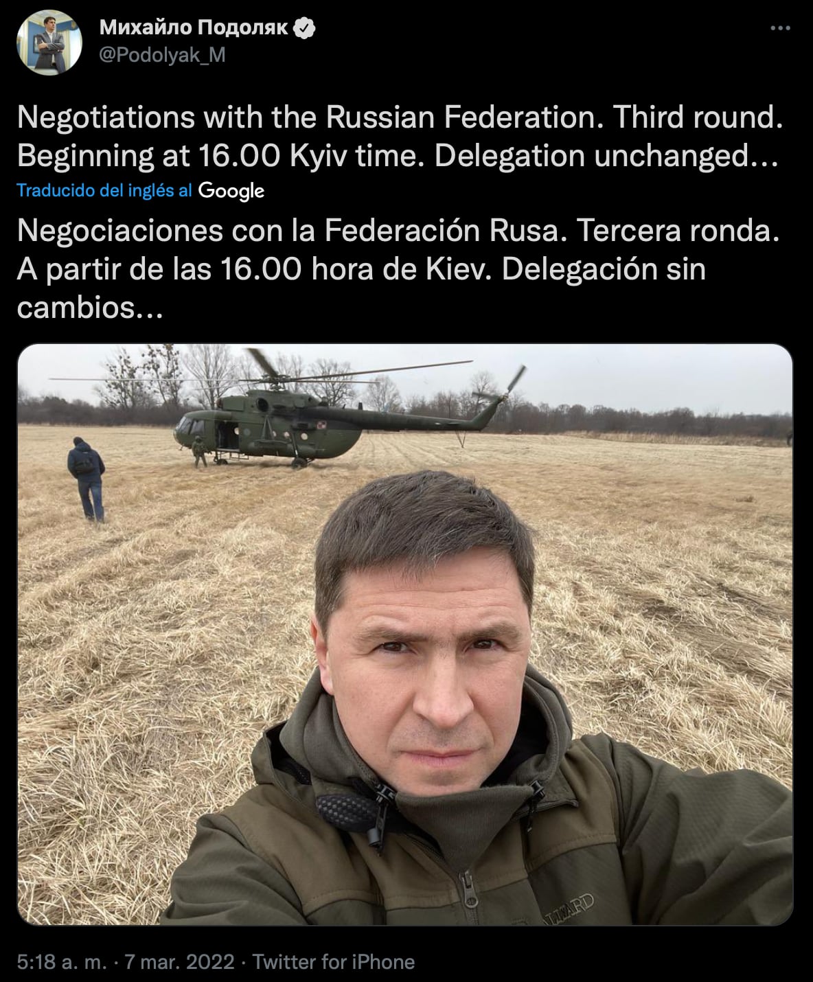 “Negociaciones con la Federación Rusa. Tercera ronda. A partir de las 16.00 hora de Kiev. Delegación sin cambios”