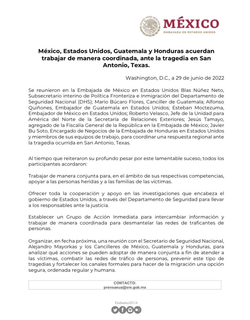 acordaron trabajar de manera conjunta en favor de las víctimas migrantes que fueron abandonadas en un tráiler en San Antonio, Texas, donde hasta el momento han muerto 53 personas.