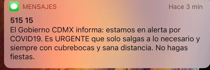 En el mensaje SMS se hace un llamado a no salir de casa, usar cubrebocas y no hacer fiestas. Sin embargo, se desconoce si el mensaje fue enviado por el gobierno de la CDMX, toda vez que no toda la población en la capital del país ha recibido la alerta.