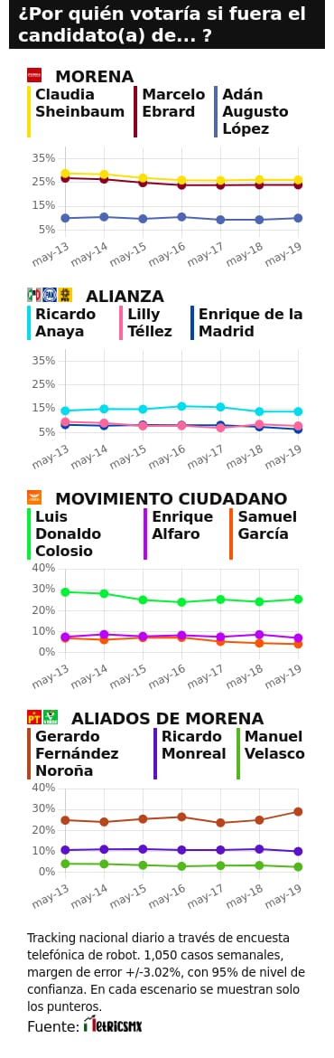 El tracking diario de SDPnoticias, es un ejercicio estadístico hecho en conjunto con MetricsMX, en donde determina quién se perfila para obtener más votos en la elección de 2024 dentro de cada grupo político, de competir por la presidencia.