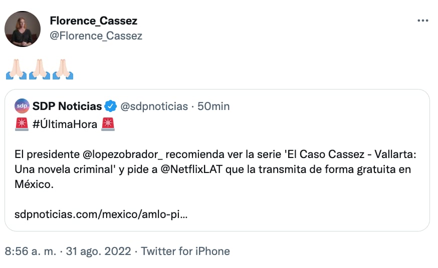 Florence Cassez compartió desde Twitter la nota de SDPnoticias, sobre la petición de AMLO a Netflix para compartir de forma gratuita todos los capítulos de “El caso Cassez Vallarta: Una novela criminal”.