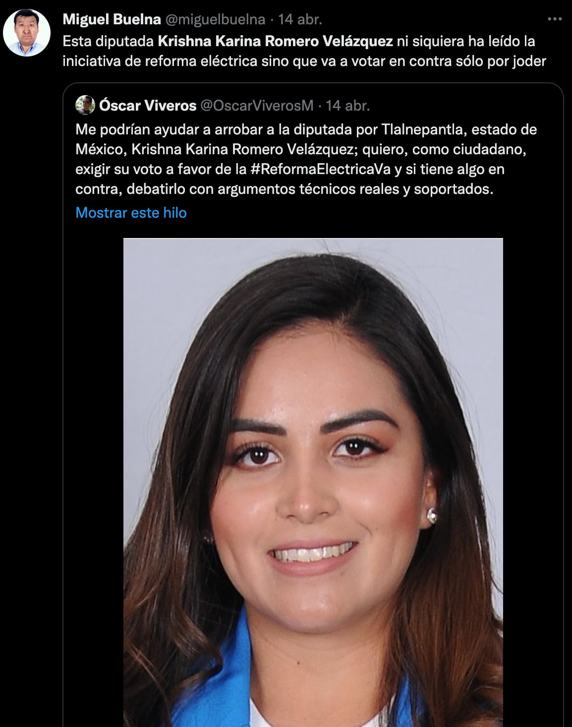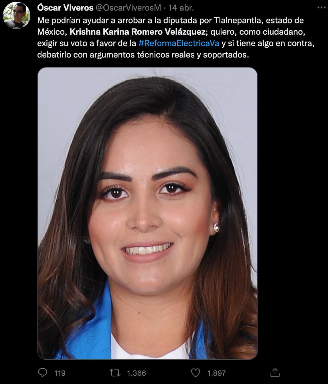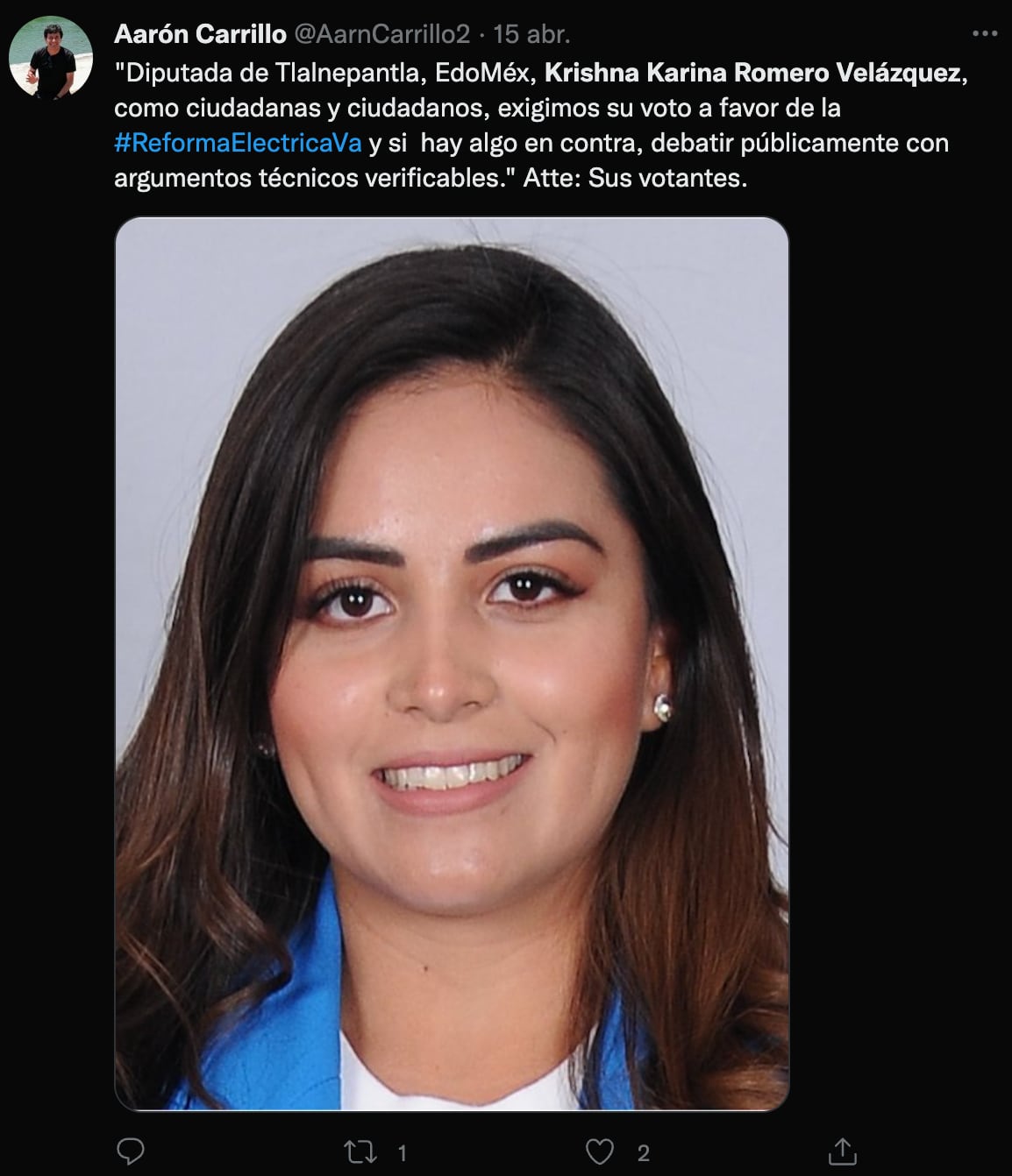 “Diputada de Tlalnepantla, EdomeMex Krishna Karina Romero Velázquez, como ciudadanas y ciudadanos, exigimos su voto a favor de la #ReformaElectricaVa y si hay algo en contra, debatir públicamente con argumentos técnicos verificables Atte: Sus votantes”