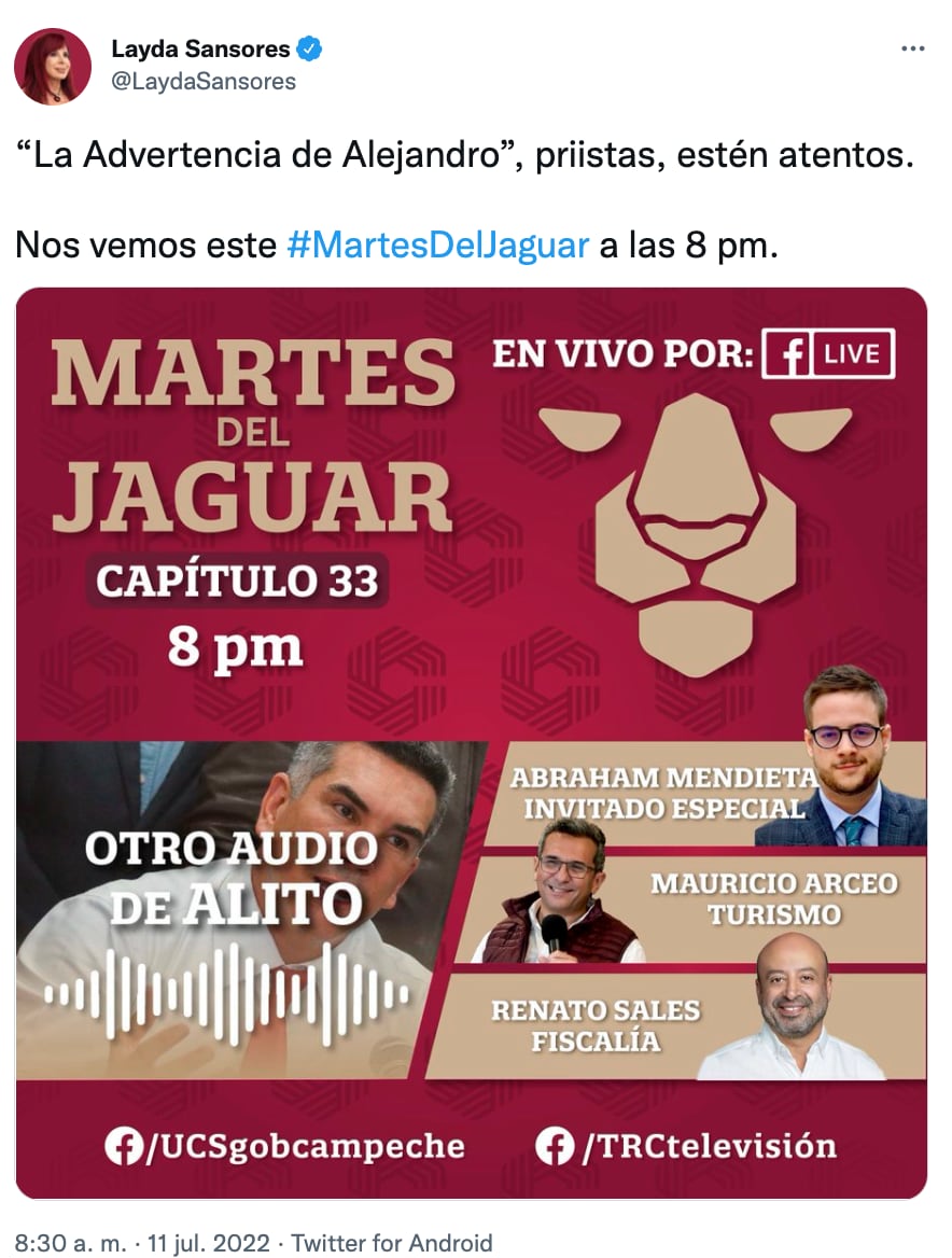 El Martes del Jaguar corre riesgo de desaparecer debido a la información que Layda Sansores difunde en él, pues incurre en violencia digital y hostigamiento.