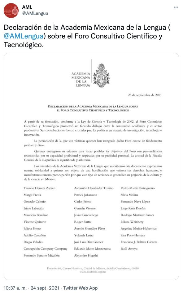 La Academia Mexicana de la Lengua consideró que la actitud de FGR hacia los científicos y académicos del Foro Consultivo Científico y Tecnológico que recibía fondos del Conacyt es arbitraria.