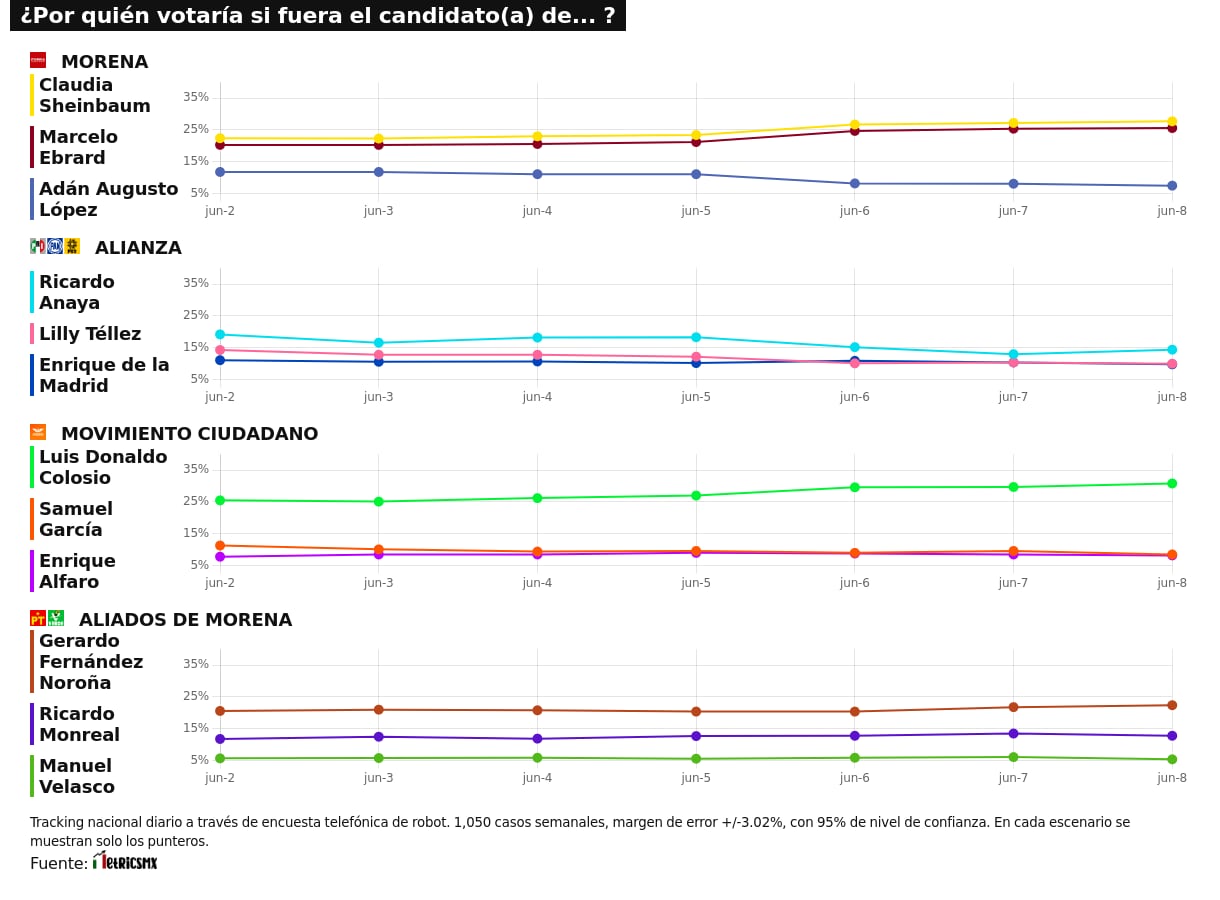 De acuerdo con el tracking diario realizado por SDPnoticias y MetricsMx, Adán Augusto López es el tercer candidato por parte de Morena y el último de las preferencias.