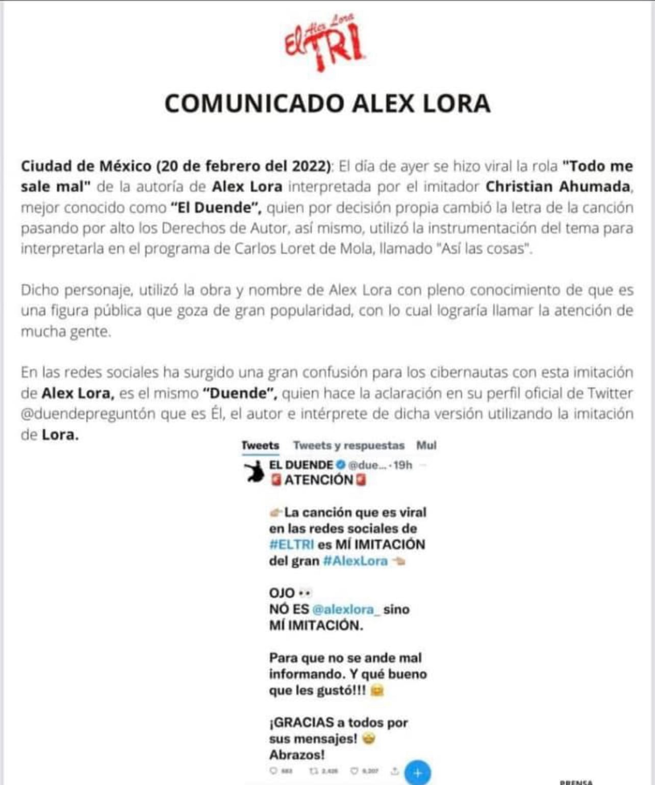 “El día de ayer se hizo viral la rola “Todo me sale mal” de la autoría de Alex Lora, interpretada por el imitador Christian Ahumada, mejor conocido como “El Duende”, quien por decisión propia cambió la letra de la canción pasando por alto los Derechos de Autor, así mismo, utilizó la instrumentación del tema para interpretarla en el programa de Carlos Loret de Mola, llamado “Así las cosas”