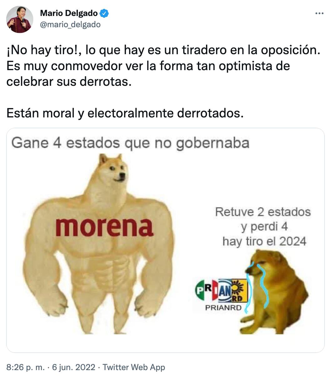 Además se burló de las declaraciones de los partidos con un meme donde califica como “conmovedor” la forma en que, de acuerdo con Delgado, ven con optimismo su derrota en las pasadas elecciones.