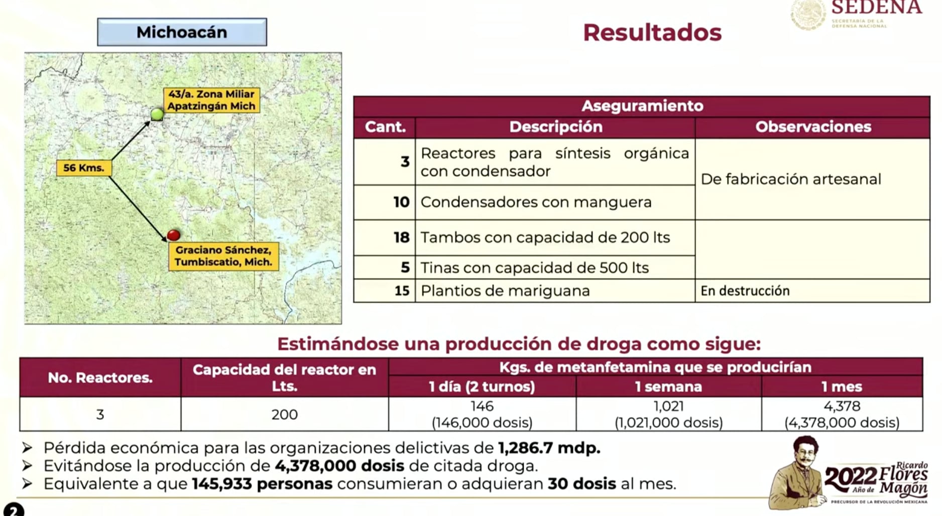Con lo asegurado se estima que puede producirse en un día 146 mil dosis de metanfetamina en un día; en un mes son 4 millones 378 mil dosis. El aseguramiento habría hecho perder cerca de 1 millón 286.7 millones de pesos.