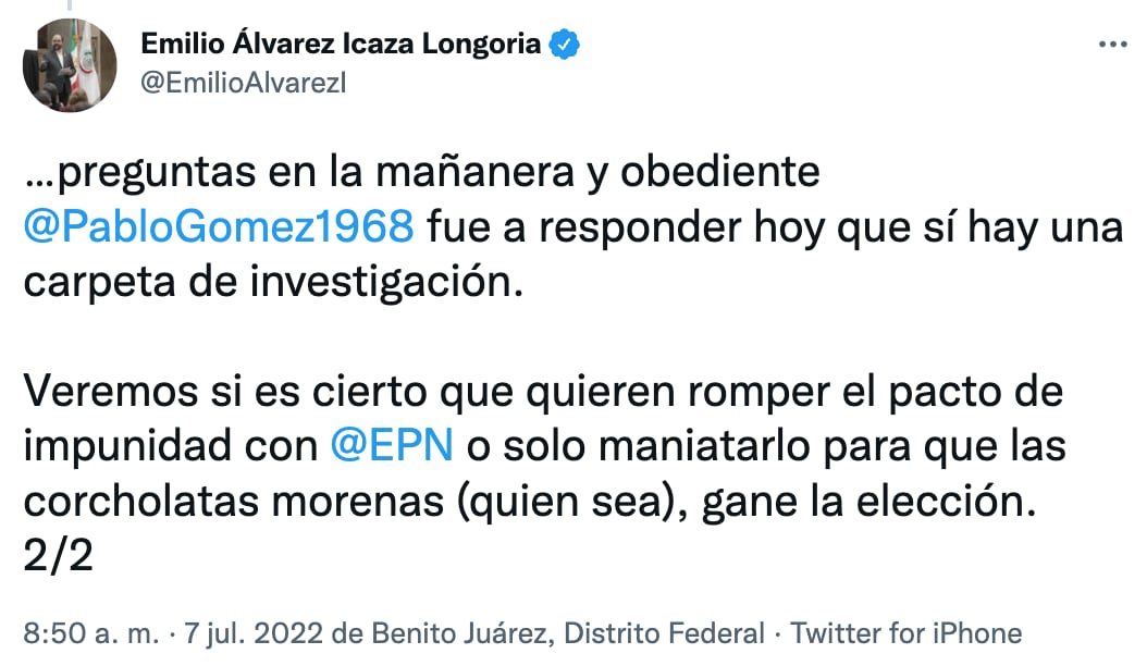 “Por eso sembraron preguntas en la mañanera y obediente @PabloGomez1968 fue a responder hoy que sí hay una carpeta de investigación. Veremos si es cierto que quieren romper el pacto de impunidad con @EPN o solo maniatarlo para que las corcholatas morenas (quien sea), gane la elección"