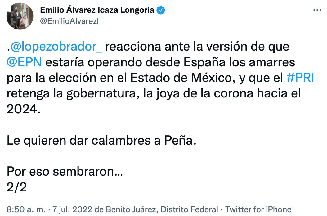 De acuerdo con el senador Álvarez Icaza, AMLO quiere que Peña Nieto no interfiera en las elecciones 2023 en el Estado de México.