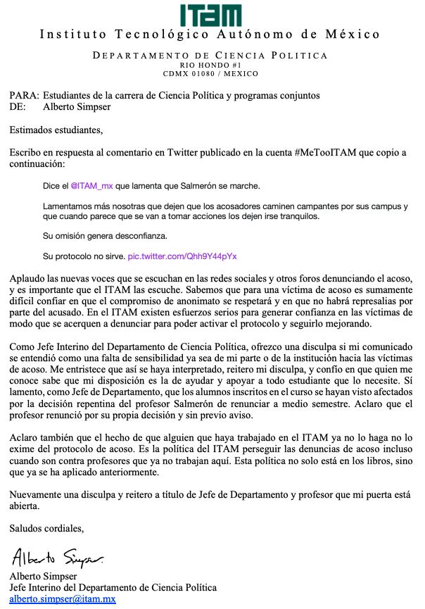 “Aclaro también que el hecho de que alguien que haya trabajado en el ITAM y ya no lo haga no lo exime del protocolo de acoso. Es política del ITAM perseguir las denuncias de acoso incluso cuando son en contra de profesores que ya no trabajan aquí. Esta política no solo está en los libros, sino que ya se ha aplicado anteriormente”