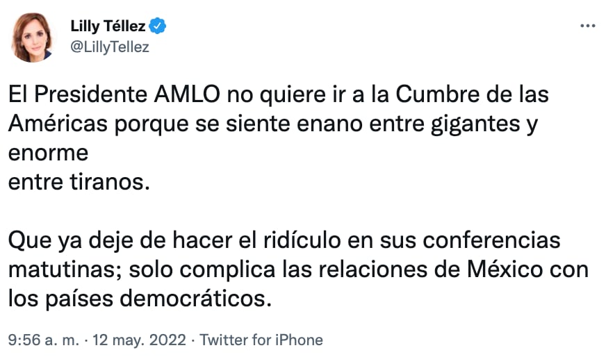 Así lo dijo luego de la senadora del Partido Acción Nacional (PAN), Lilly Téllez, dijera que AMLO no va a la Cumbre de las Américas 2022 porque se siente enano.