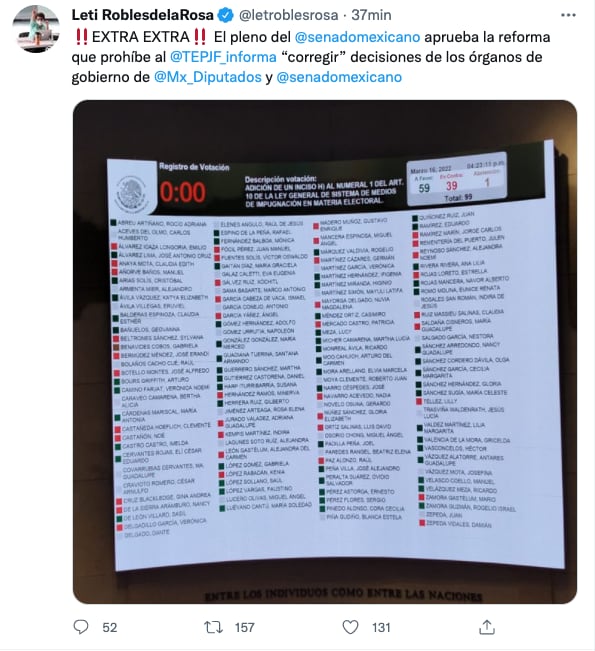 La noticia fue dada a conocer por la periodista Lety Robles de la Rosa, quien expresó por medio de su cuenta de Twitter, que la decisión se tomó con 59 votos a favor, 39 en contra y una abstención.