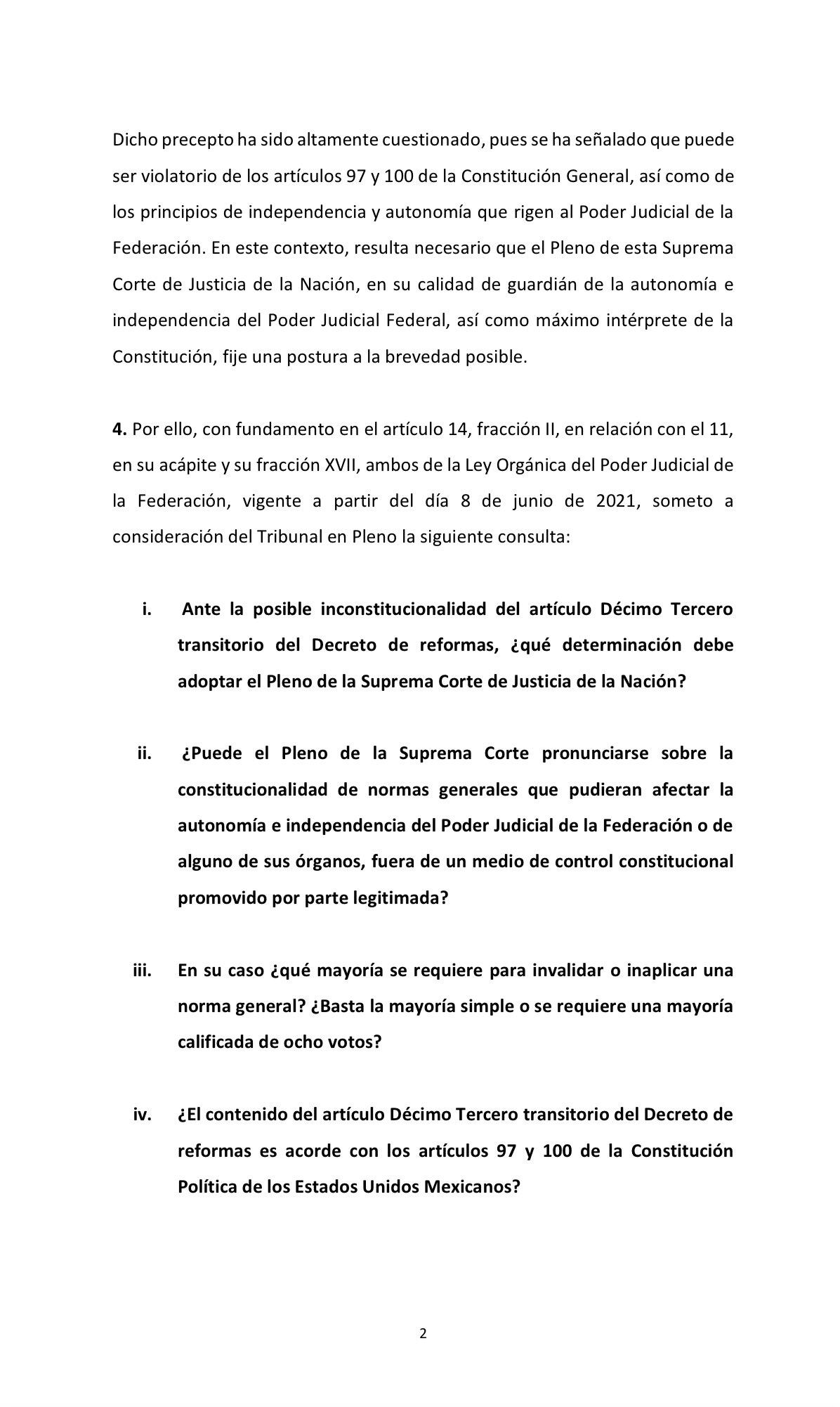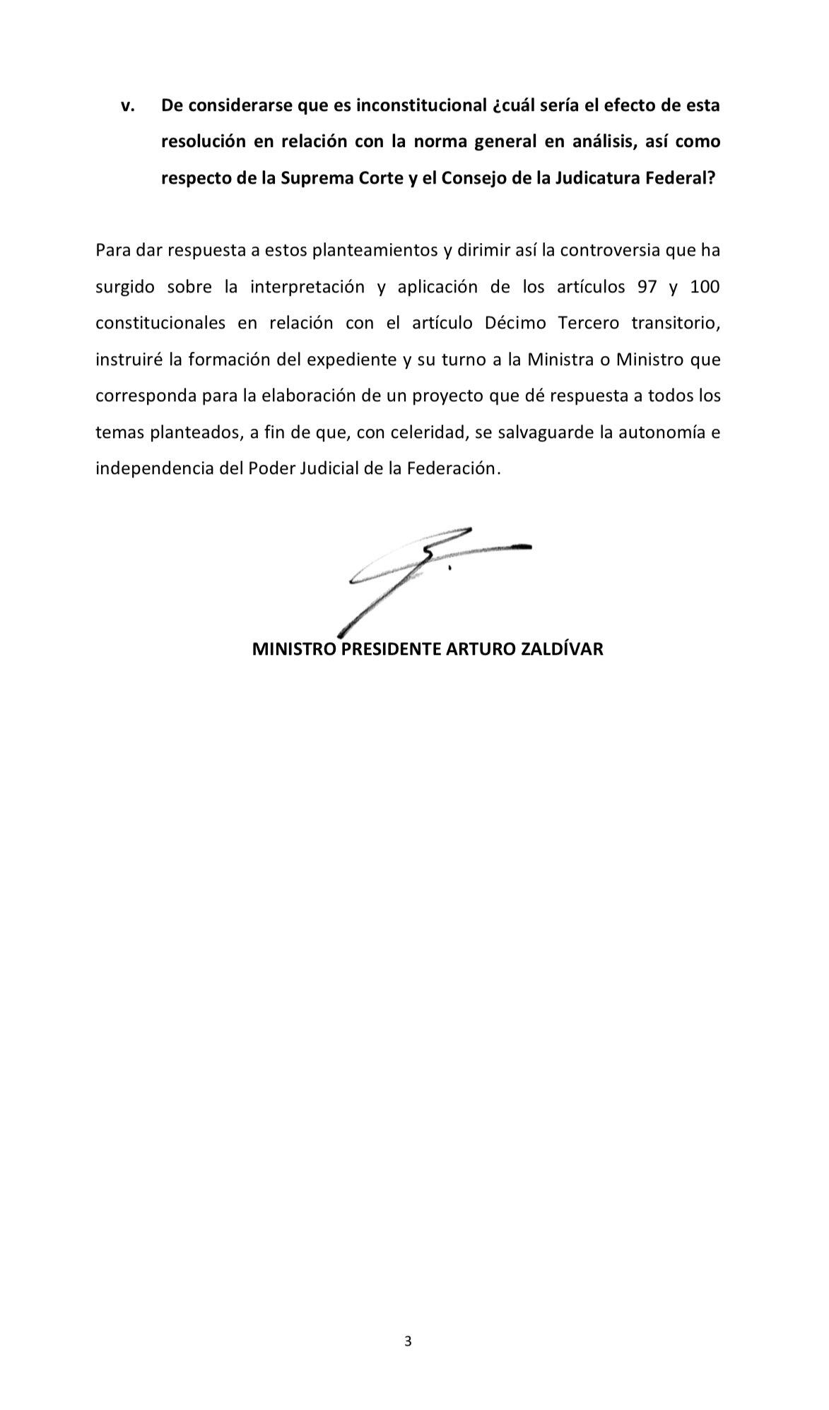 Desde Twitter, Arturo Zaldívar compartió el escrito con el que inició el procedimiento para que el Pleno de la SCJN se pronuncie sobre la constitucionalidad del artículo decimo tercero a la reforma judicial.