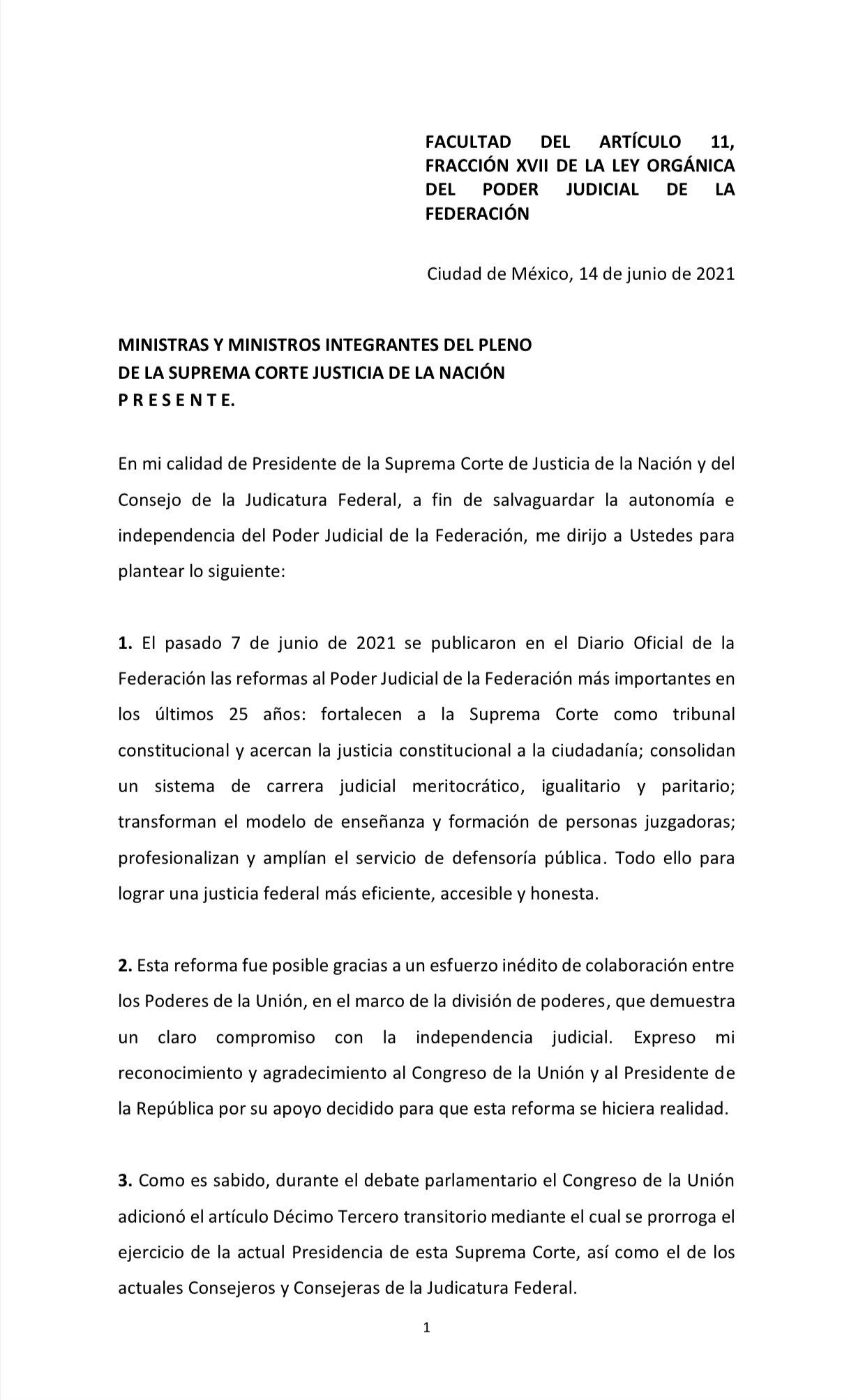 Asimismo, Arturo Zaldívar aseguró que instruirá la formación del expediente, así como su turno al ministro que corresponda para la elaboración de un proyecto de respuesta a los planteamientos para salvaguardar la autonomía del Poder Judicial de la Federación.