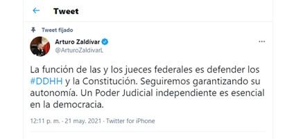 A través de su cuenta de Twitter, el también presidente del Consejo de la Judicatura Federal (CJF), Arturo Zaldívar, resaltó que un Poder Judicial independiente es esencial en la democracia en México: