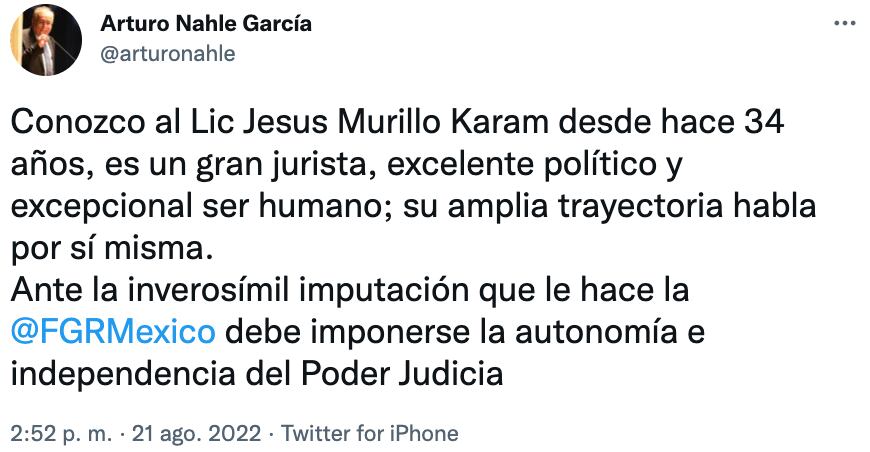 “Conozco al Lic Jesus Murillo Karam desde hace 34 años, es un gran jurista, excelente político y excepcional ser humano; su amplia trayectoria habla por sí misma. Ante la inverosímil imputación que le hace la @FGRMexico debe imponerse la autonomía e independencia del Poder Judicial”