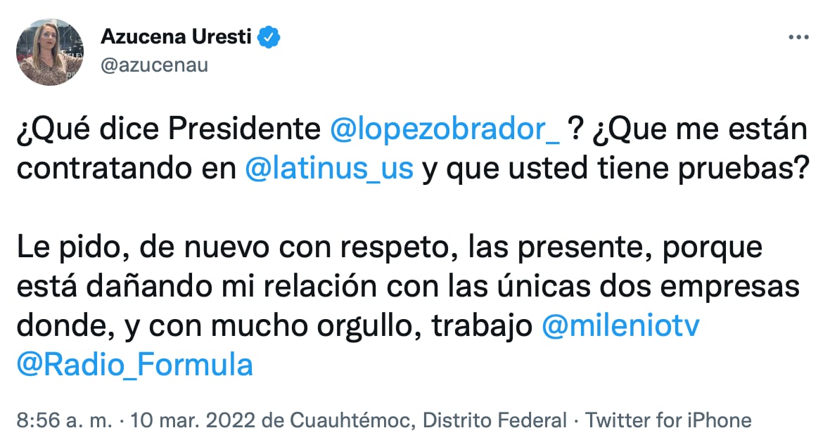 “¿Qué dice Presidente @lopezobrador_ ? ¿Que me están contratando en @latinus_us y que usted tiene pruebas? Le pido, de nuevo con respeto, las presente, porque está dañando mi relación con las únicas dos empresas donde, y con mucho orgullo, trabajo @mileniotv @Radio_Formula”