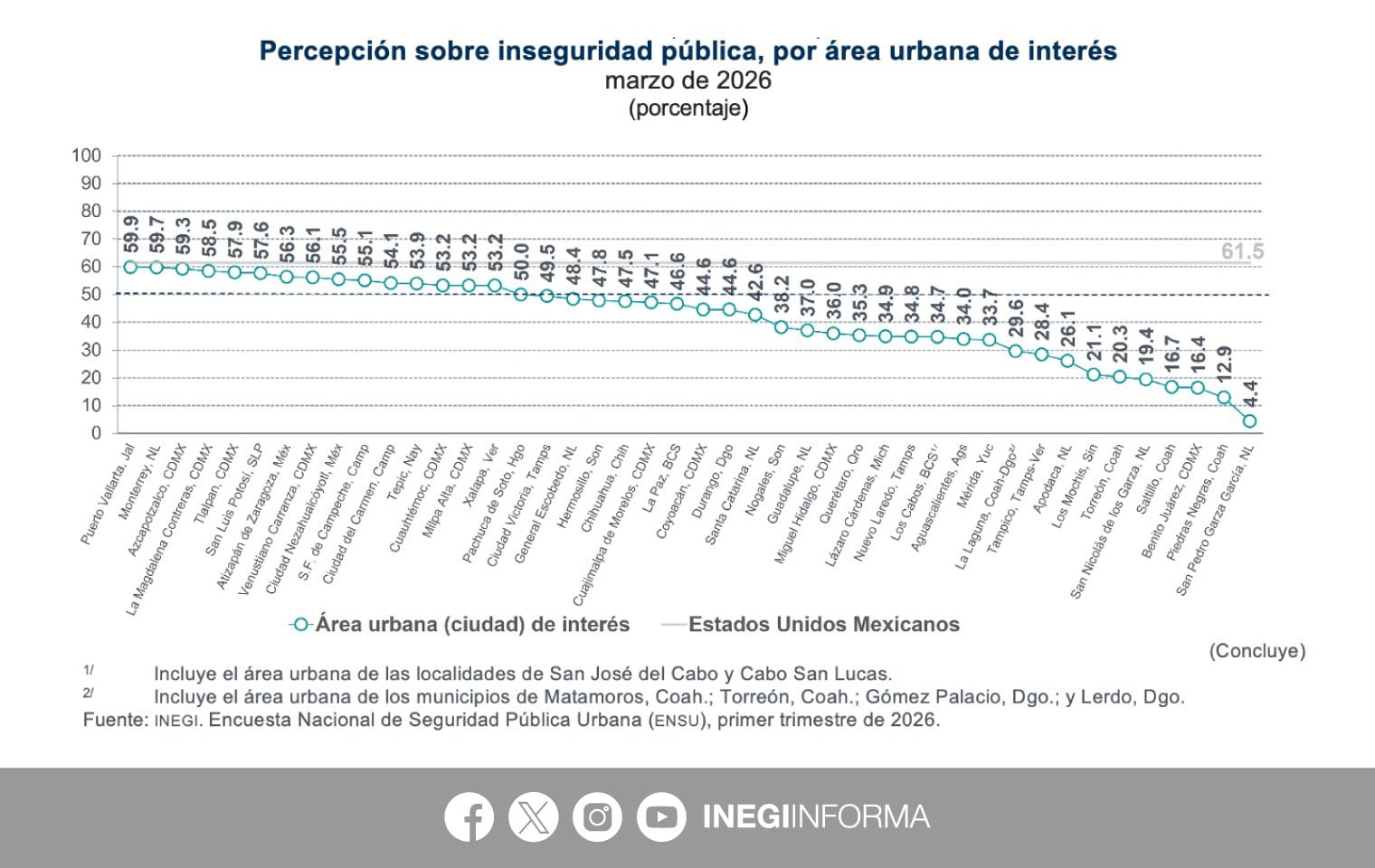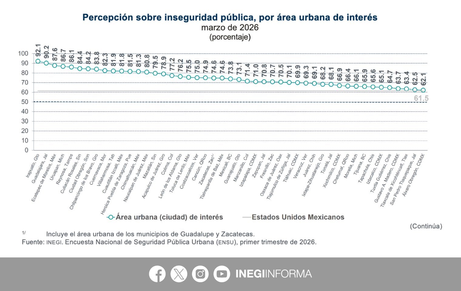 “De 63.8 en diciembre a 61.5 en marzo del 2026. La percepción de seguridad tiene que ver con distintos temas, obviamente pues primero son los delitos que se cometen en el lugar donde se vive. Esta encuesta se hace en las principales ciudades del país, las ciudades de más habitantes en México.”
