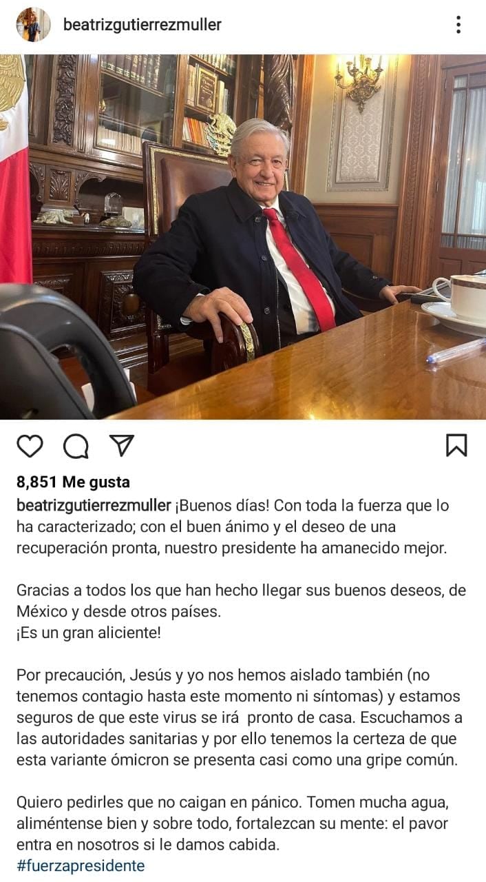 Además, le deseó una pronta recuperación a su esposo, “nuestro presidente”, que, según compartió Gutiérrez Müller, amaneció mejor.
