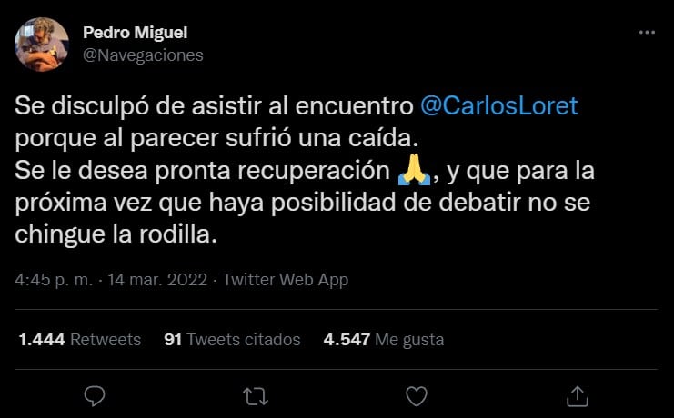 El periodista Carlos Loret de Mola no fue a un evento con Pedro Miguel y otros periodistas porque se cayó. Así lo expresó el escritor en su cuenta personal de Twitter, en la cual le deseó una pronta recuperación en tono sarcástico al columnista de El Universal.