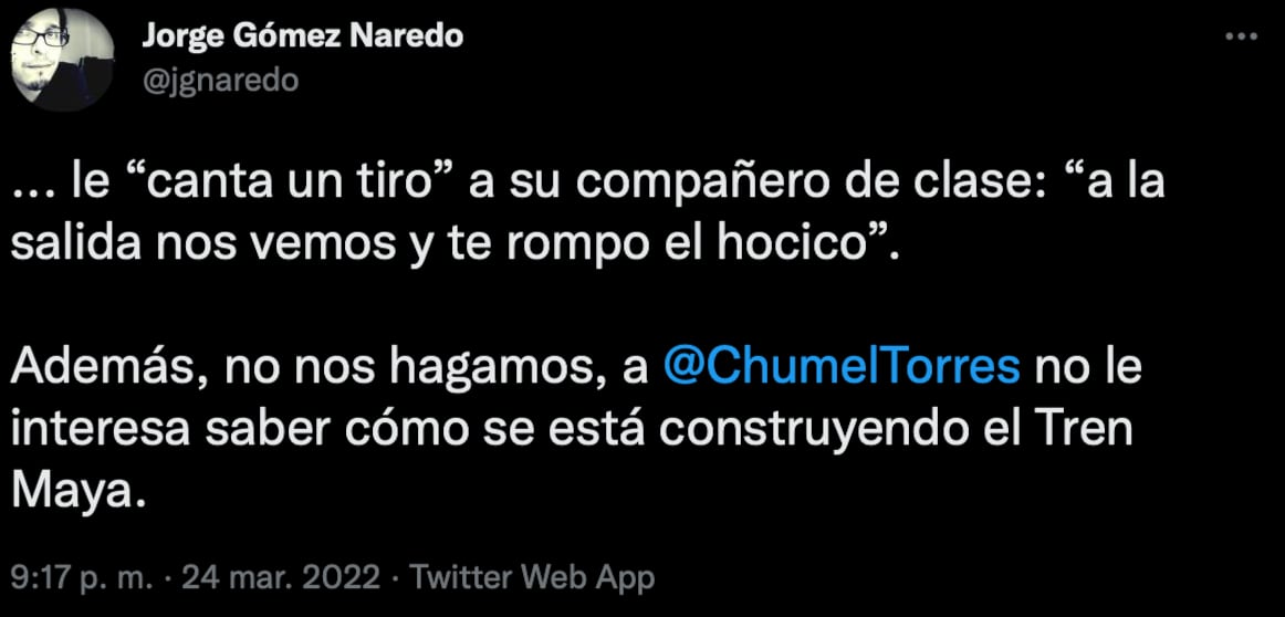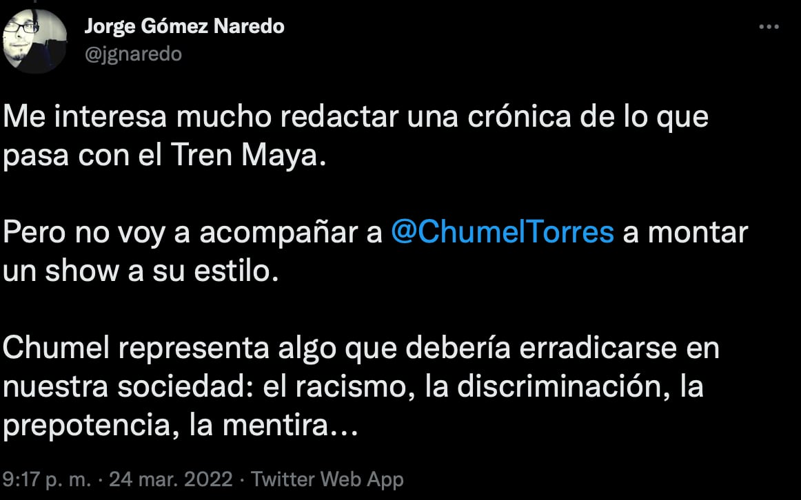 “Me interesa mucho redactar una crónica de lo que pasa con el Tren Maya. Pero no voy a acompañar a @ChumelTorres a montar un show a su estilo. Chumel representa algo que debería erradicarse en nuestra sociedad: el racismo, la discriminación, la prepotencia, la mentira…”