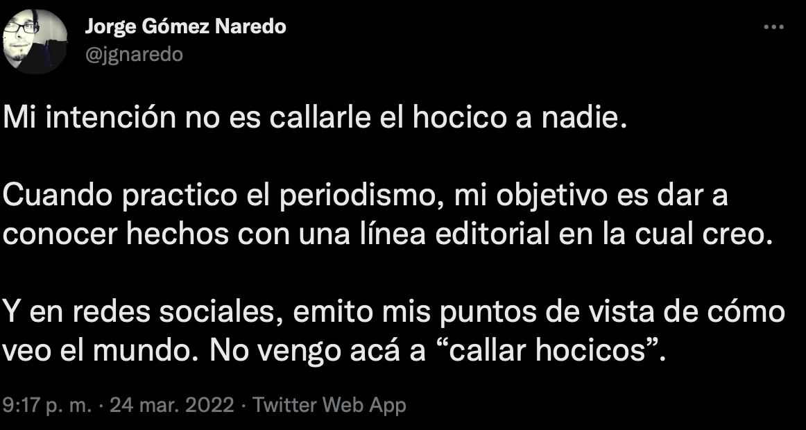 Gómez aclaró que desde su práctica del periodismo, da a conocer los hechos desde la línea editorial en la que cree y sus redes son para emitir su punto de vista.