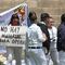 Durante la presentación, trabajadores de la salud se manifestaron con pancartas y gritos con los que exigían, entre otras cosas, obtener su base.