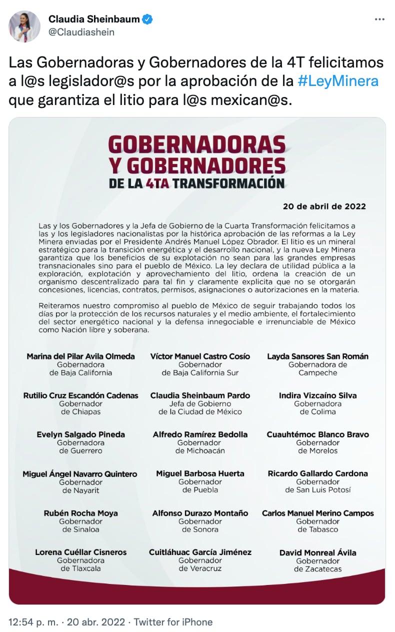 La jefa de gobierno de la Ciudad de México (CDMX), Claudia Sheinbaum, así como los gobernadores de Morena, felicitaron a los legisladores que aprobaron la Ley Minera, tras el revés a la reforma eléctrica.