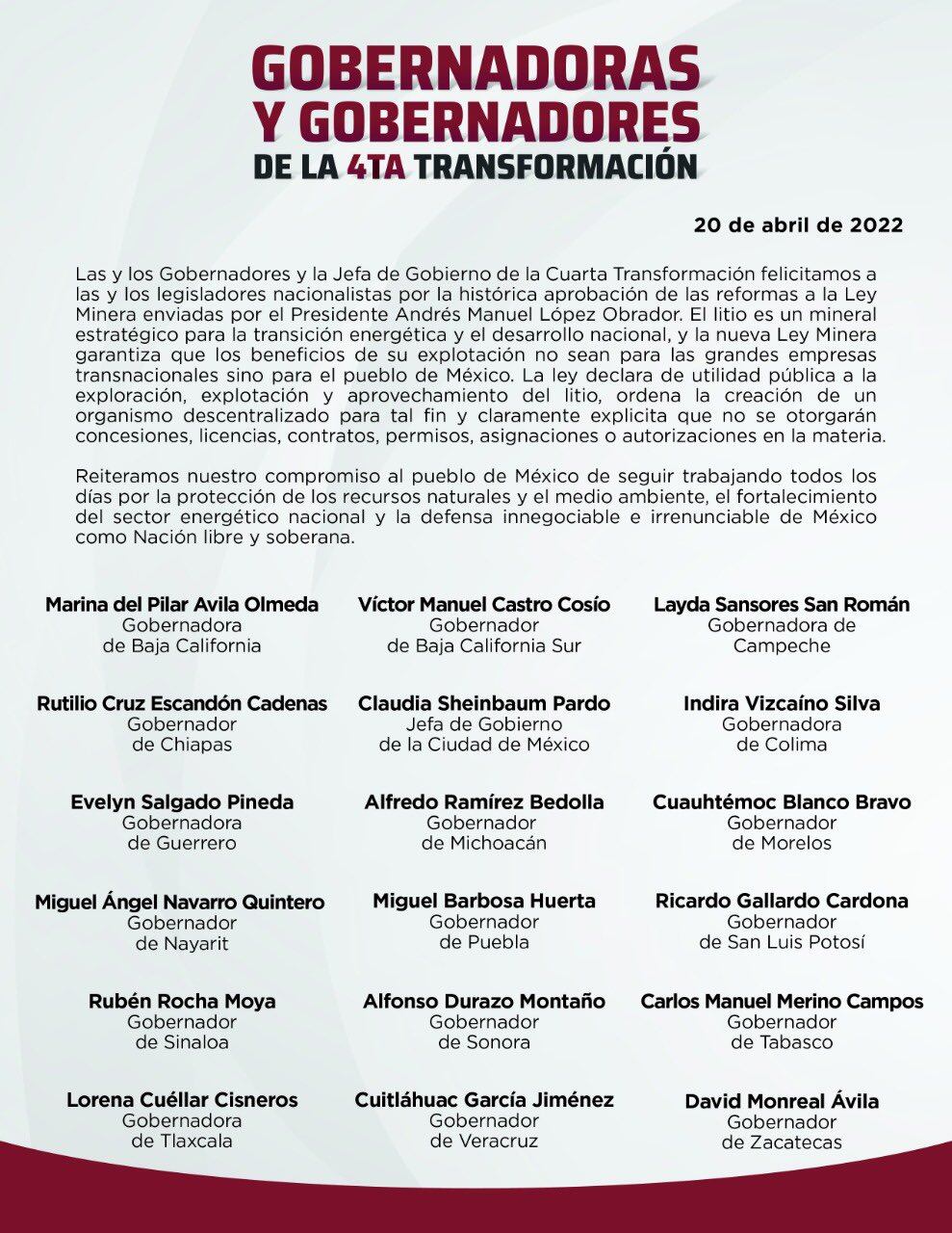 Asimismo, mostraron su alegría por la aprobación del decreto que fue publicado el 20 de abril en el Diario Oficial de la Federación (DOF) para garantizar que el litio sea “para los mexicanos”.