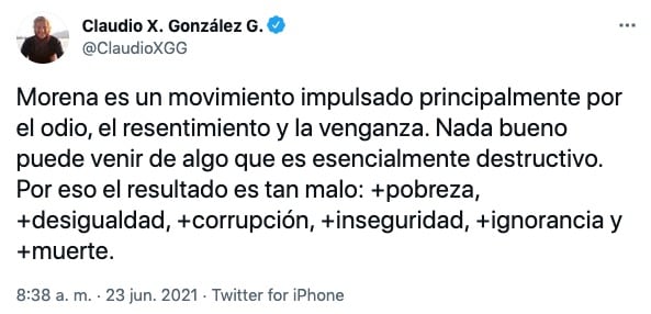 “Morena es un movimiento impulsado principalmente por el odio, el resentimiento y la venganza. Nada bueno puede venir de algo que es esencialmente destructivo. Por eso el resultado es tan malo: +pobreza, +desigualdad, +corrupción, +inseguridad, +ignorancia y +muerte”