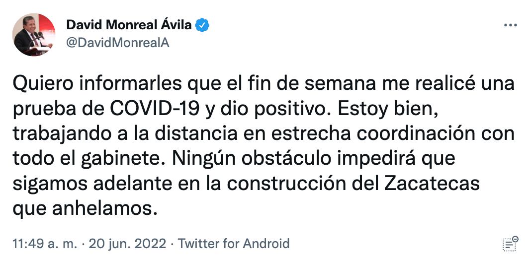 “Quiero informarles que el fin de semana me realicé una prueba de COVID-19 y dio positivo. Estoy bien, trabajando a la distancia en estrecha coordinación con todo el gabinete. Ningún obstáculo impedirá que sigamos adelante en la construcción del Zacatecas que anhelamos”