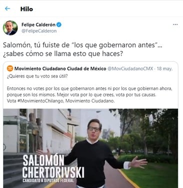 México.- A través de redes sociales, el expresidente Felipe Calderón criticó un spot en donde participa el candidato a diputado federal por el distrito 10 de la alcaldía Miguel Hidalgo, Salomón Chertorivski.