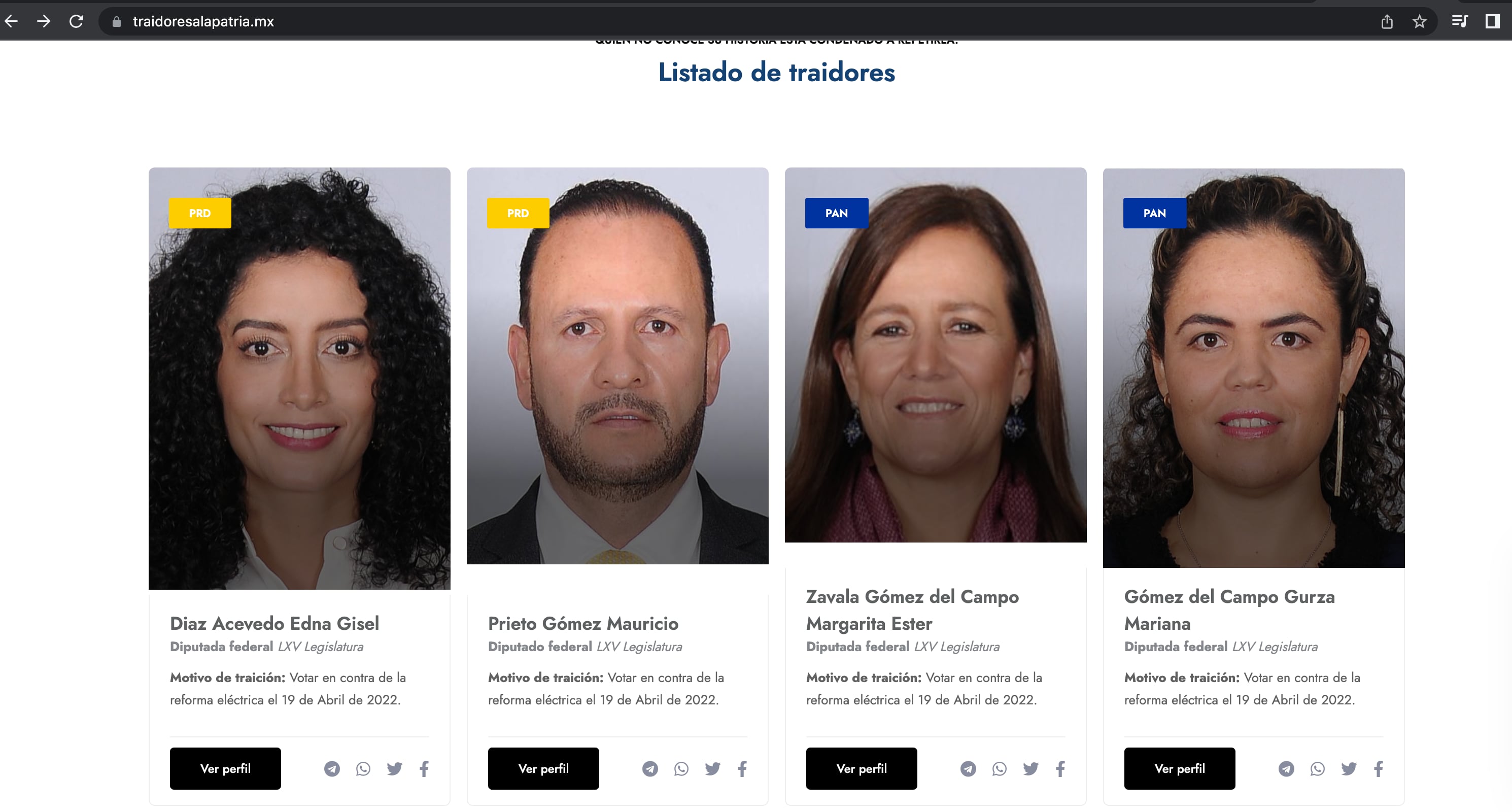 Se trata del sitio traidoresalapatria.mx donde se enlistan los diputados de diferentes partidos que votaron en contra de la reforma el pasado domingo 17 de abril, durante la Semana Santa.