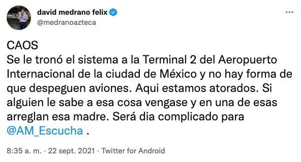 “CAOS. Se le tronó el sistema a la Terminal 2 del Aeropuerto Internacional de la ciudad de México y no hay forma de que despeguen aviones. Aqui estamos atorados. Si alguien le sabe a esa cosa vengase y en una de esas arreglan esa madre”