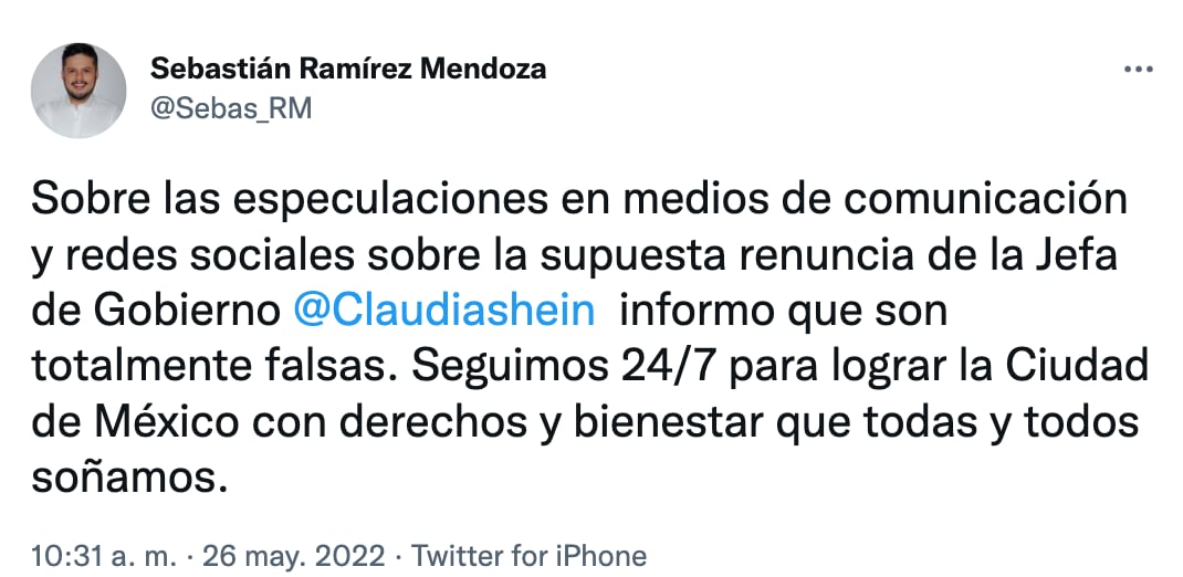 “Sobre las especulaciones en medios de comunicación y redes sociales sobre la supuesta renuncia de la Jefa de Gobierno @Claudiashein informo que son totalmente falsas. Seguimos 24/7 para lograr la Ciudad de México con derechos y bienestar que todas y todos soñamos"