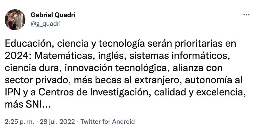 Sin embargo, el 27 de julio Gabriel Quadri anunció que será candidato para las elecciones 2024 y desde entonces comenzó a compartir sus propuestas en materia educativa, así como en “seguridad y progreso”.
