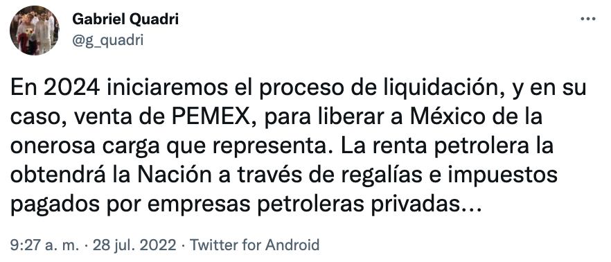 De acuerdo con Quadri, iniciará el proceso de liquidación y posible venta de Pemex “para liberar a México de la onerosa carga que representa”.