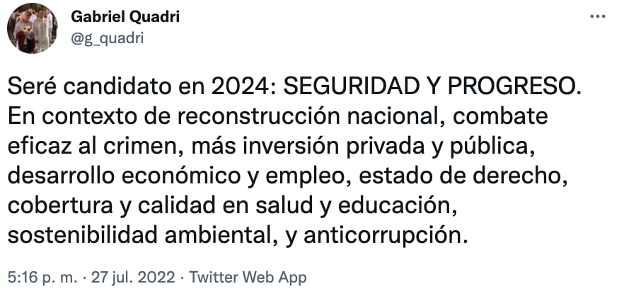 “Seré candidato en 2024: Seguridad y Progreso. En contexto de reconstrucción nacional, combate eficaz al crimen, más inversión privada y pública, desarrollo económico y empleo, estado de derecho, cobertura y calidad en salud y educación, sostenibilidad ambiental, y anticorrupción”