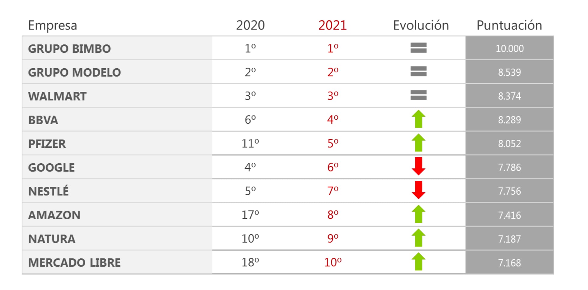 La lista la lidera Bimbo por quinta edición consecutiva. Seguido por Grupo Modelo y Walmart que conservan sus lugares anteriores. Siendo Pfizer, Amazon y Mercadolibre, las empresas con una mejora significativa, pasando del Top 20 al Top 10 este año. Mientras que Google y Nestlé bajaron 2 lugares en el ranking.
