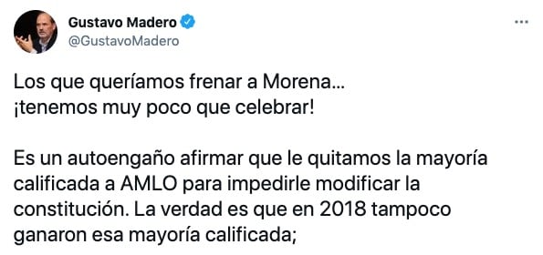 “Los que queríamos frenar a Morena… ¡tenemos muy poco que celebrar! Es un autoengaño afirmar que le quitamos la mayoría calificada a AMLO para impedirle modificar la constitución. La verdad es que en 2018 tampoco ganaron esa mayoría calificada”
