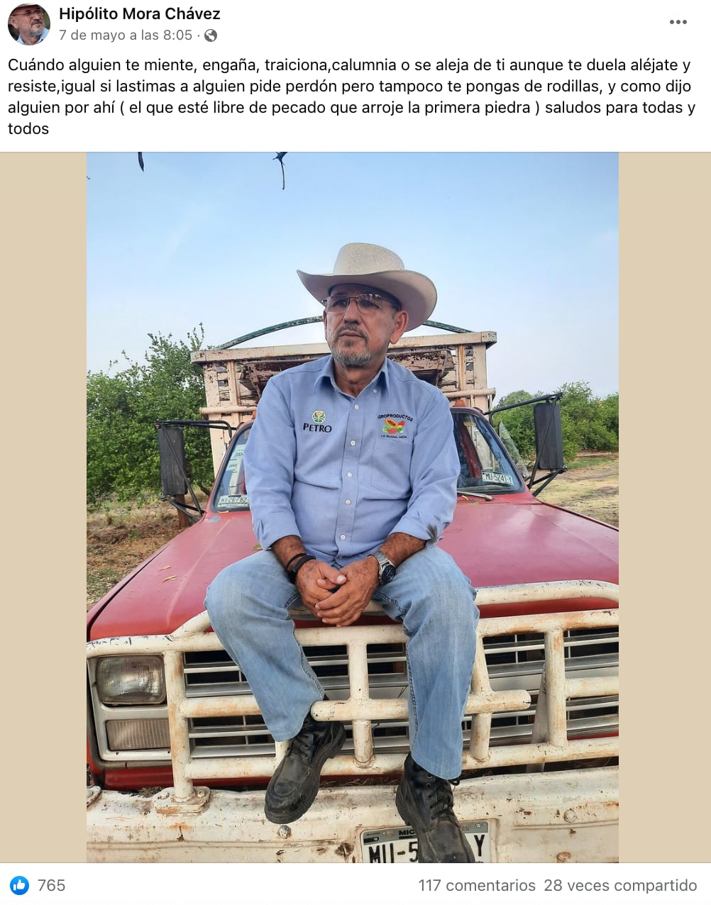 Hipólito Mora compartió una fotografía donde se le ve sobre una camioneta roja con una camisa de Agroproductos de La Ruana, y un sombrero.