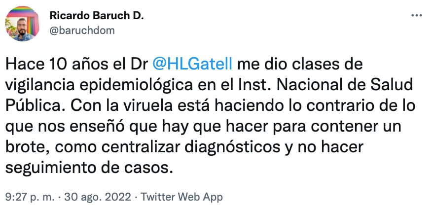 “En este tema de enfermedades infecciosas, como lo podría ser la viruela pues es donde él tenía o tiene un expertise muy importante pero pues a nivel de lo que está haciendo ahora en la secretaría de Salud para contener el brote estamos viendo que prácticamente nada de esas recomendaciones que uno aprende”