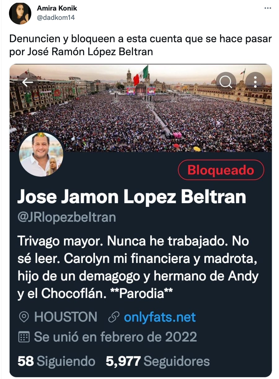 Cabe resaltar que usuarios de Twitter denunciaron la creación de otras cuentas a nombre de José Ramón López Beltran para hacerse pasar por él, pese a que se anuncia que es una cuenta parodia, que usa el mismo usuario que tenía el primogénito de AMLO @JRlopezbeltran