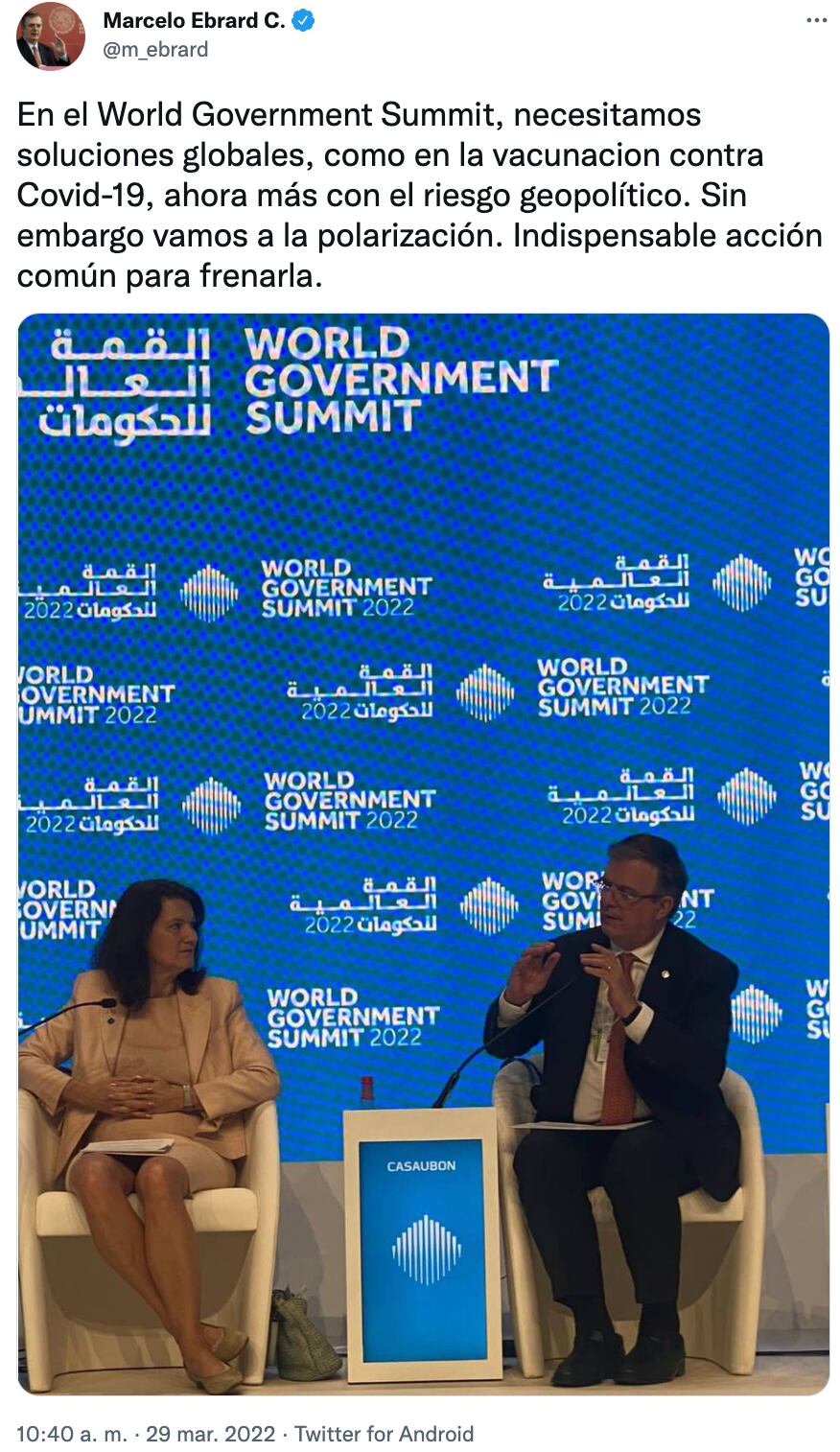 Marcelo Eebrard participó en el World Government Summit para hablar sobre la vacunación y el conflicto geopolítico de Rusia con Ucrania.